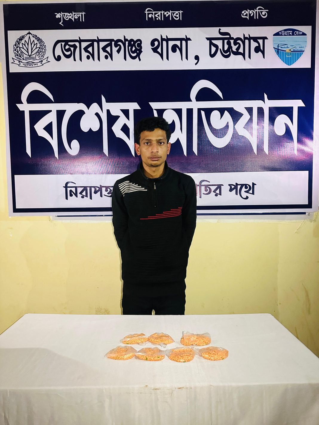 মঙ্গলবার বিকেল ৪ টা ৪৫ মিনিটে সহকারী পুলিশ সুপার মিরসরাই সার্কেল মোঃ নাদিম হায়দার চৌধুরী এর নেতৃত্বে এসআই(নিঃ) হান্নান আল মামুন সঙ্গীয় অফিসার ফোর্স’সহ জোরারগঞ্জ থানা এলাকার গোপন সংবাদের ভিত্তিতে বারইয়ারহাট পৌরসভাস্থ উত্তর সোনাপাহাড় আলনুর হাসপাতালের বিপরীত পাশে ঢাকা-চট্টগ্রাম মহাসড়কের উপর অভিযান পরিচালনা করে নজরুল ইসলাম (২৬) নামে এক যুবক আটক করা হয়। আটককৃত যুবক মোঃ নজরুল ইসলাম কে তল্লাশি করলে ৩৫৪৬ পিস ইয়াবা ট্যাবলেট উদ্ধার ও ০১টি হোন্ডা কোম্পানীর লিভো মোটরসাইকেল জব্দ করা হয়। এই ঘটনায় জোরারগঞ্জ থানার এস আই হান্নান আল মামুন বাদী হয়ে মাদকদ্রব্য নিয়ন্ত্রণ আইনে মামলা দায়ের করেন।